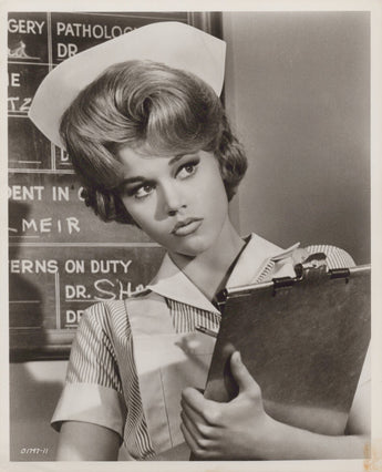 This vintage photograph captures the stunning Hollywood actress Jane Fonda during her role in the movie Period of Adjustment, which was produced in 1962. The photograph is printed on glossy paper with a size of 8 x 10 inches and features a black and white image of Jane Fonda. This original gelatin-silver print is an antique and is sold as a single piece without framing.