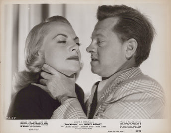 This vintage photograph features Hollywood stars Jeanne Cagney and Mickey Rooney in the movie Quicksand from 1950. The image measures 10 x 8 inches and is printed on paper. It is an original, licensed print, and is in black and white. The photo captures the two actors in a scene from the film, with Cagney in a glamorous pose. The image is perfect for collectors of Hollywood memorabilia or fans of classic movies. It is an antique item that will make a great addition to any collection.