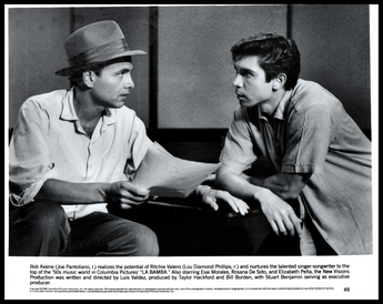 Step into the nostalgic world of music and cinema history with this captivating vintage movie photo featuring Joe Pantoliano and Lou Diamond Phillips from the iconic film "La Bamba" (1986). This snapshot captures the essence of their performances and the cultural significance of the movie.