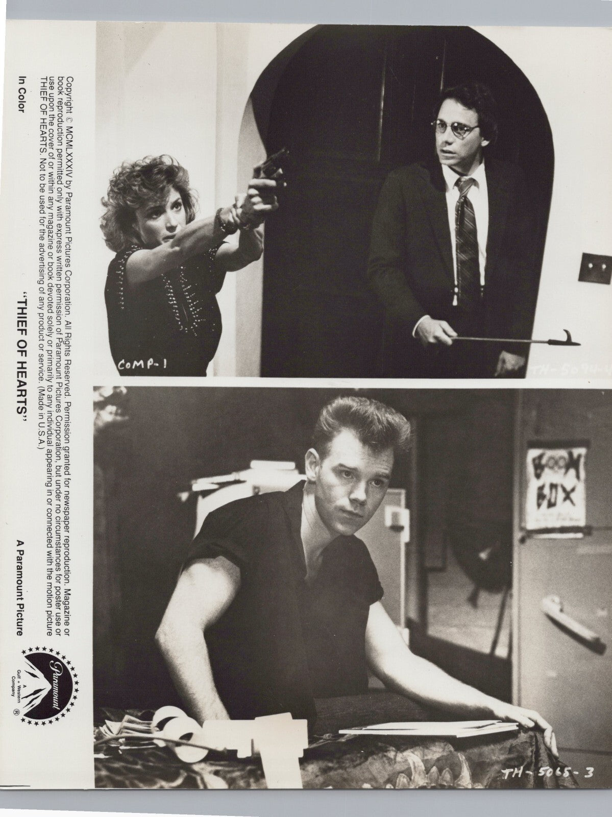 This vintage black and white photograph measures 8 x 10 inches and features actors John Getz, David Caruso, and Barbara Williams. The photo, produced in 1984 using gelatin-silver print production technique, showcases the three celebrities in a movie-themed setting.
