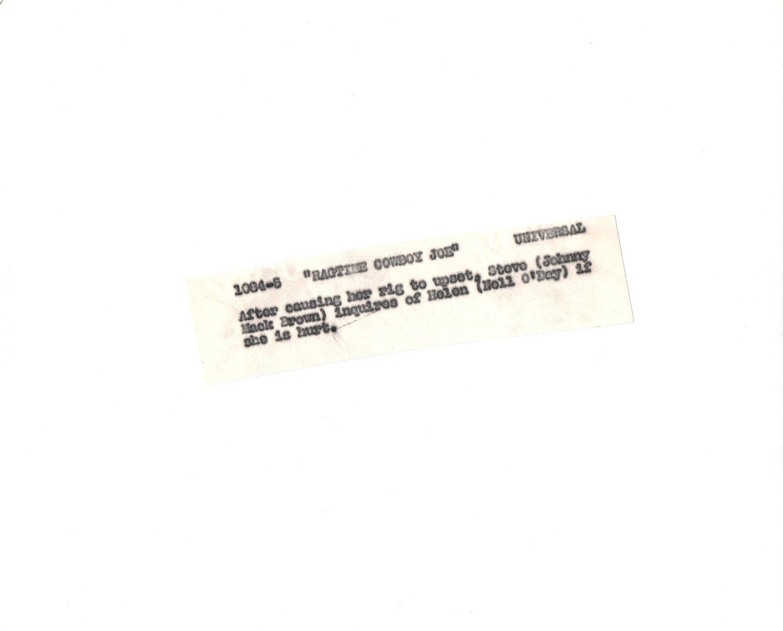This vintage photograph showcases Johnny Mack Brow and Nell O'Day in the movie Ragtime Cowboy Joe from 1940. The 10 x 8 inch print captures the actors in black and white and comes on glossy paper. It is an original gelatin-silver print, unframed and available for sale as a single piece. The photograph is a great addition to any collection of Hollywood memorabilia and vintage movie items. It features the theme of movie and celebrities and portrays the subjects of actress, actors, and a woman. The production technique used to create this photograph is gelatin-silver print and it was made in the United States.