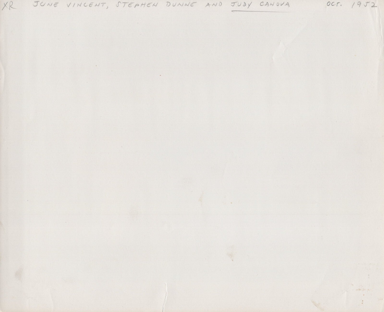 This vintage photograph (K 325) features three iconic names from Hollywood's Golden Age - Judy Canova, Stephen Dunne, and June Vincent. The black and white gelatin-silver print measures 10 x 8 inches and is an original piece, not a licensed reprint.