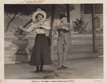 This vintage photograph features two Hollywood legends, Judy Garland and Mickey Rooney, in the 1940 film Strike Up the Band. The black and white gelatin-silver print measures 10 x 8 inches and is an original production from the United States. As collectors of antique memorabilia may know, these two actors were well-known collaborators and friends in the movie industry. The photo captures them in a scene from the musical comedy and would make a wonderful addition to any collection of vintage Hollywood photographs.