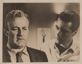 This is a unique and authentic vintage photograph from the movie The Garment Jungle (1957). The black and white image measures 10 x 8 inches and is printed on glossy paper using the gelatin-silver print production technique. It features actors Lee J. Cobb and Kerwin Mathews in a scene from the movie. The photo is unframed and comes as a single piece.
