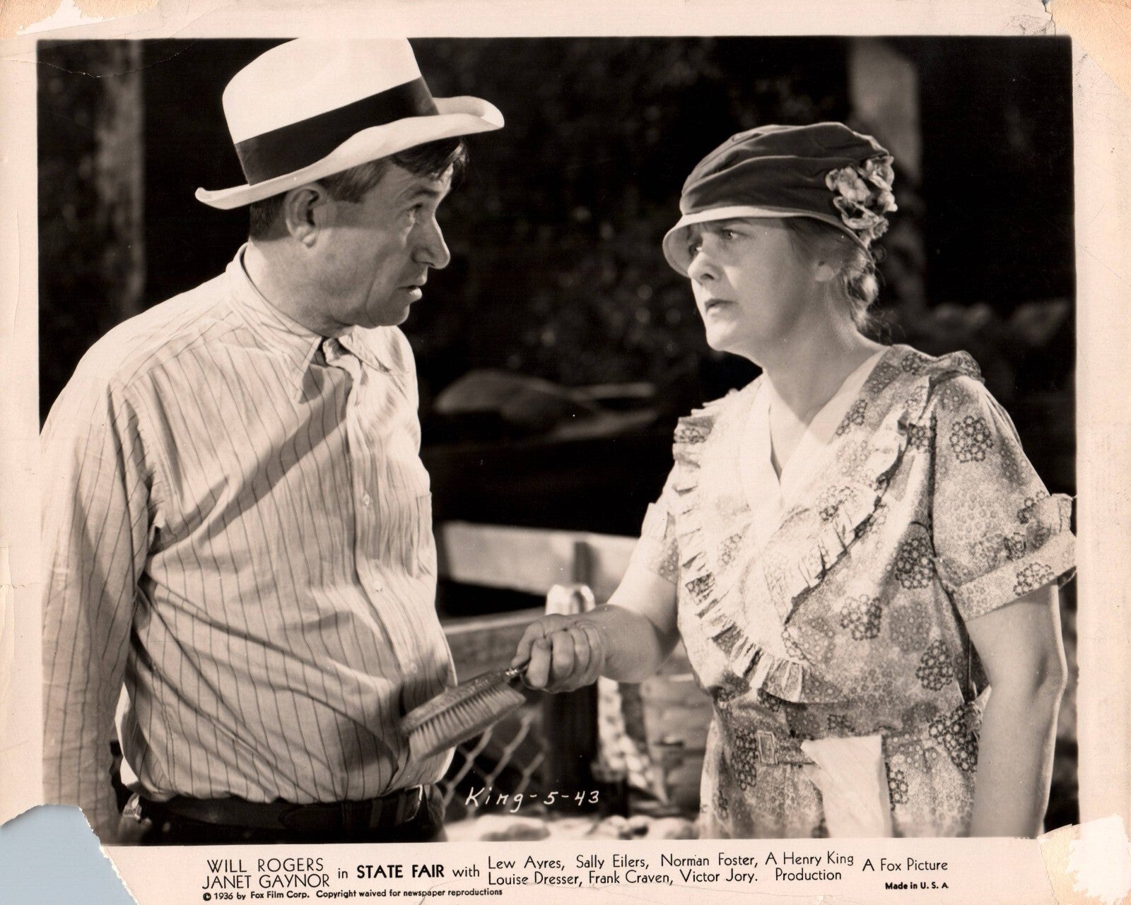 This vintage photograph features actress Louise Dresser and actor Will Rogers in their iconic roles from the 1933 movie, State Fair. The black and white image measures 8 x 10 inches and is an original gelatin-silver print. It is unframed and has a glossy finish.