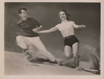 This vintage photograph features the famous dancing duo Marge Champion and Gower Champion in a black and white glossy finish. The 10x8 inch gelatin-silver print showcases the talented performers in a Hollywood movie setting, with a focus on their legs. The photograph is an original production from the United States, dating back to 1940, making it a unique and rare collectible for antique enthusiasts and fans of classic Hollywood. The unframed photo is perfect for display and would make an excellent addition to any collection.