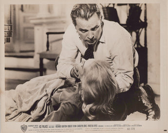This vintage photograph features Richard Burton and Carolyn Jones in the movie Ice Palace (1960). The black and white image measures 10 x 8 inches and is printed on paper using the gelatin-silver technique. It depicts the two actors in character and is an original production from the United States.
