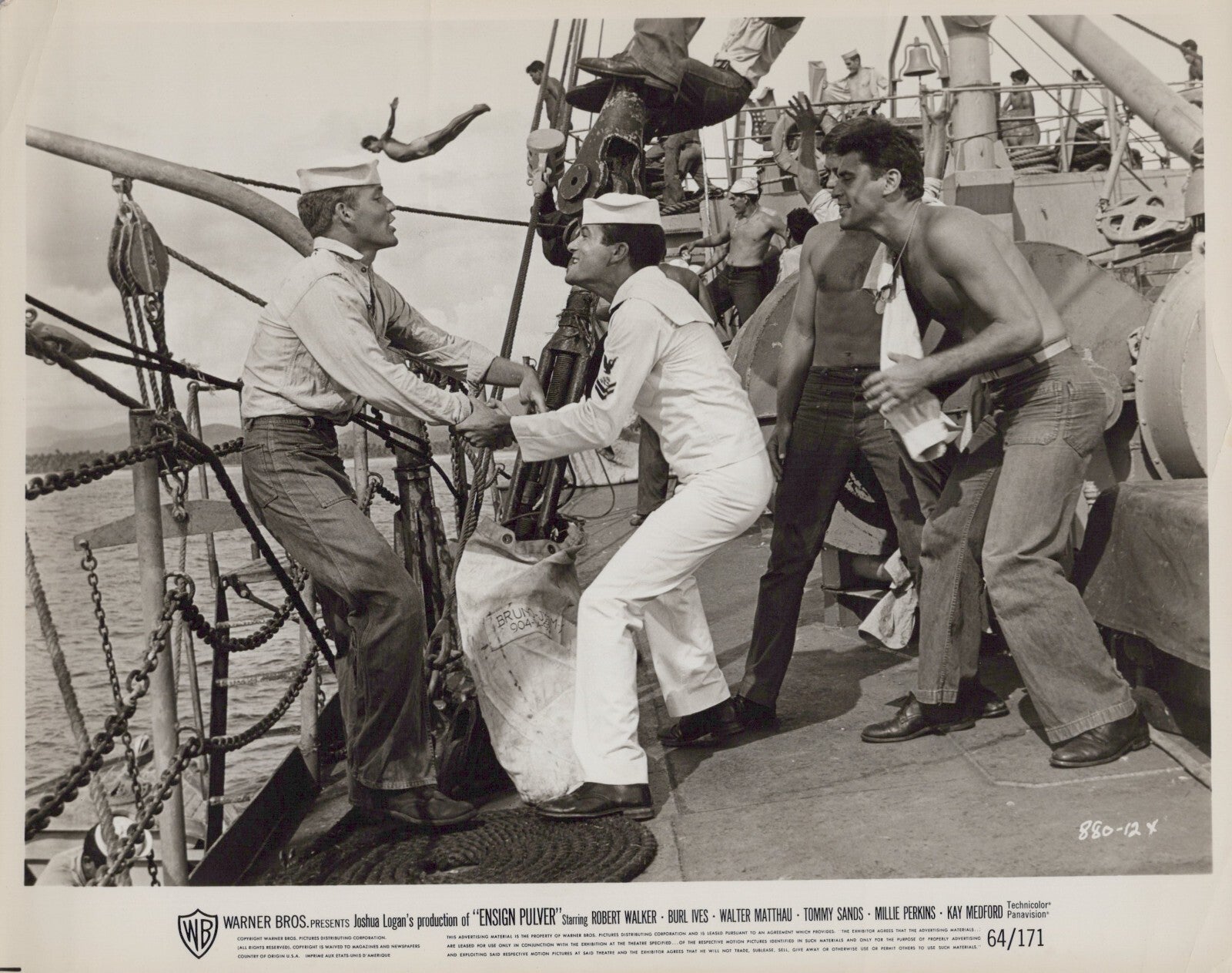 This vintage gelatin-silver print photograph captures Robert Walker Jr. and Tommy Sands in their roles in the Hollywood movie Ensign Pulver, produced in the United States in 1964. The photograph, measuring 10 x 8 in, features the actors in black and white and is made of paper material. It is an original print and not a licensed reprint. The image depicts the actors in their characters and is a collectible item for Hollywood and movie enthusiasts. The photograph is in excellent physical shape and would make a perfect addition to any collection.