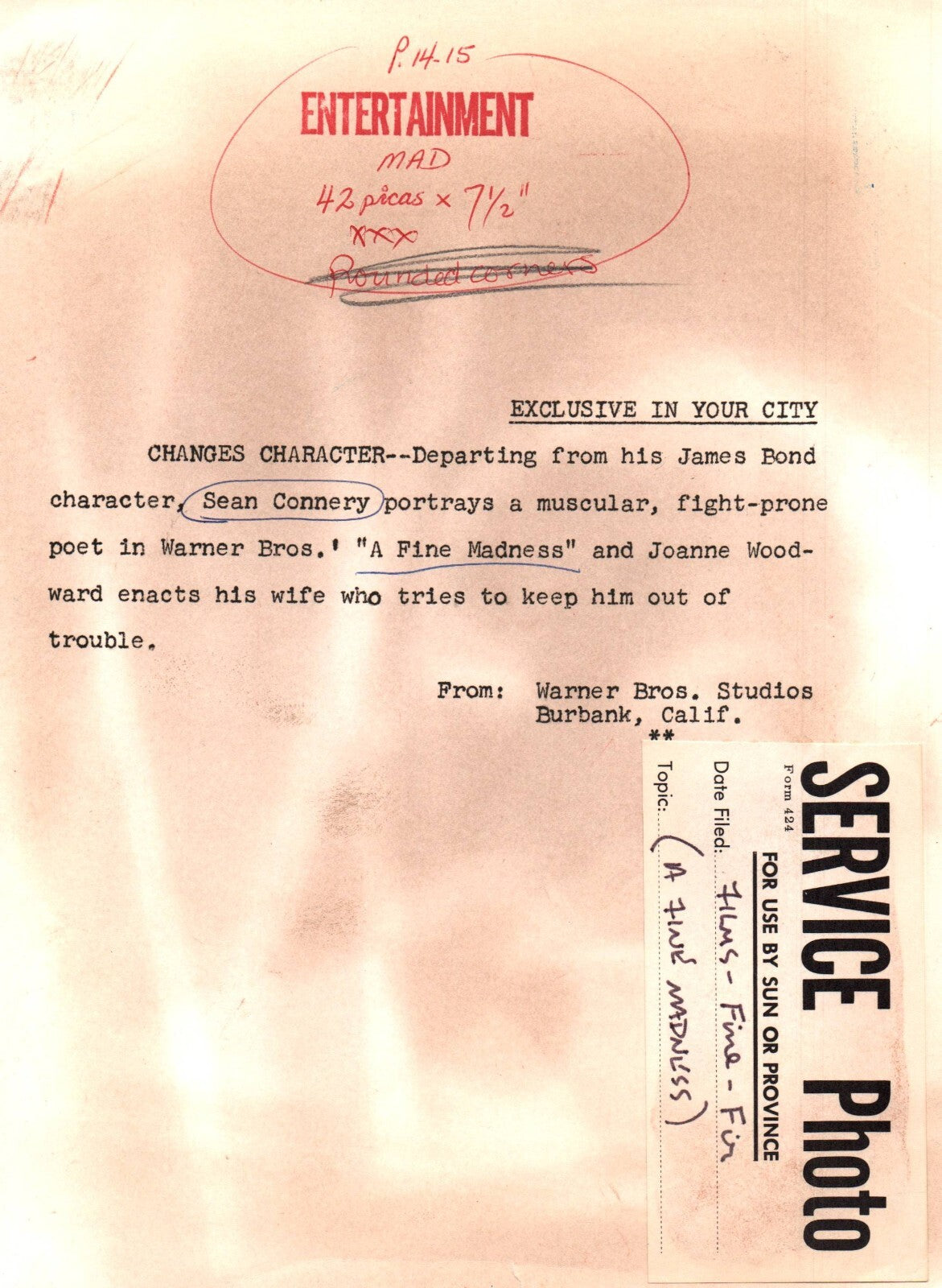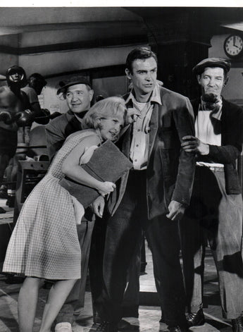 This vintage photograph captures a momentous scene from the 1966 film "A Fine Madness" starring Sean Connery and Joanne Woodward. The image measures 7 x 9 inches and is printed on high-quality paper in black and white, with a glossy finish. The photograph is an original, produced using gelatin-silver printing techniques in the United States.