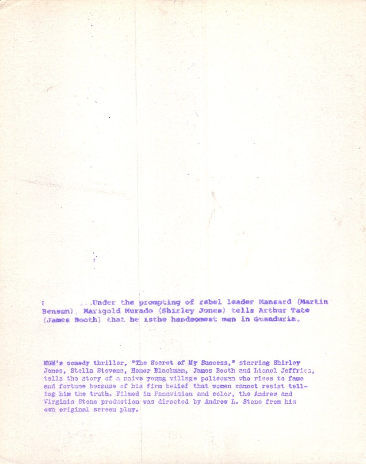 Discover a rare piece of 1960s cinematic history with this original vintage photograph featuring Shirley Jones and James Booth in The Secret of My Success (1965). This delightful British film blends comedy and drama, with both Jones and Booth delivering standout performances that captivate the screen. This photograph captures their on-screen chemistry and the film’s timeless charm. Whether you're a fan of Shirley Jones, James Booth, or classic 1960s British cinema, this vintage still is a must-have addition to any collection of film memorabilia.