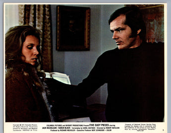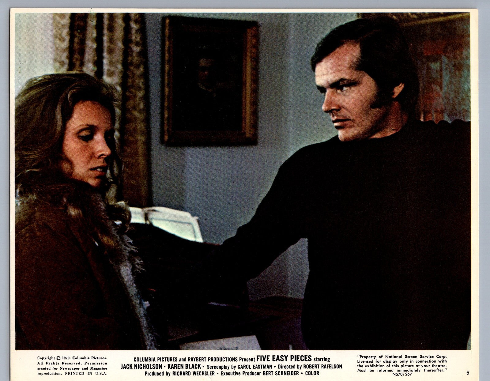 This vintage black and white photograph captures a memorable scene from the critically acclaimed movie "Five Easy Pieces" (1970). The photo features actors Susan Anspach and Jack Nicholson in a captivating moment. Measuring 10 x 8 inches, it is an original gelatin-silver print on glossy paper, with no framing.