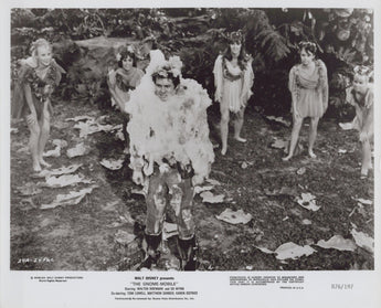 This vintage photograph features actors Tom Lowell and Karen Dotrice in the Hollywood movie The Gnome-Mobile (1967). The black and white image is printed on paper and measures 10 x 8 inches. It is an original production technique gelatin-silver print from the United States.