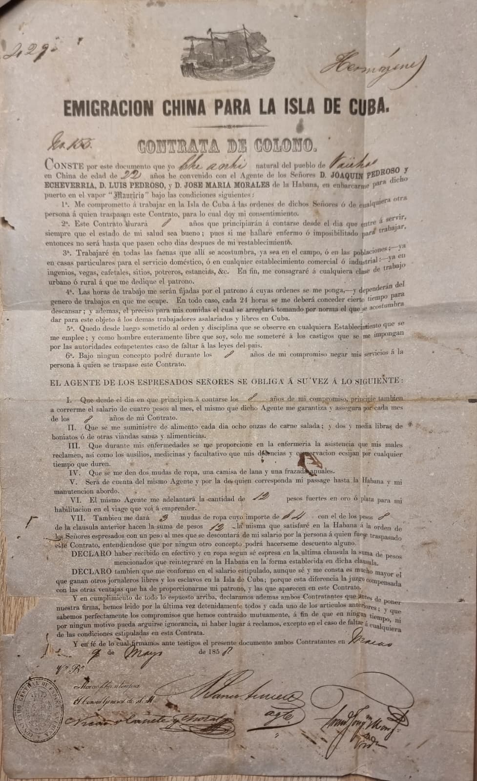 Cuba Original Chinese Indentured Laborer Contract (1858) – Steamship "Mauricio" – From Macau to Havana D1