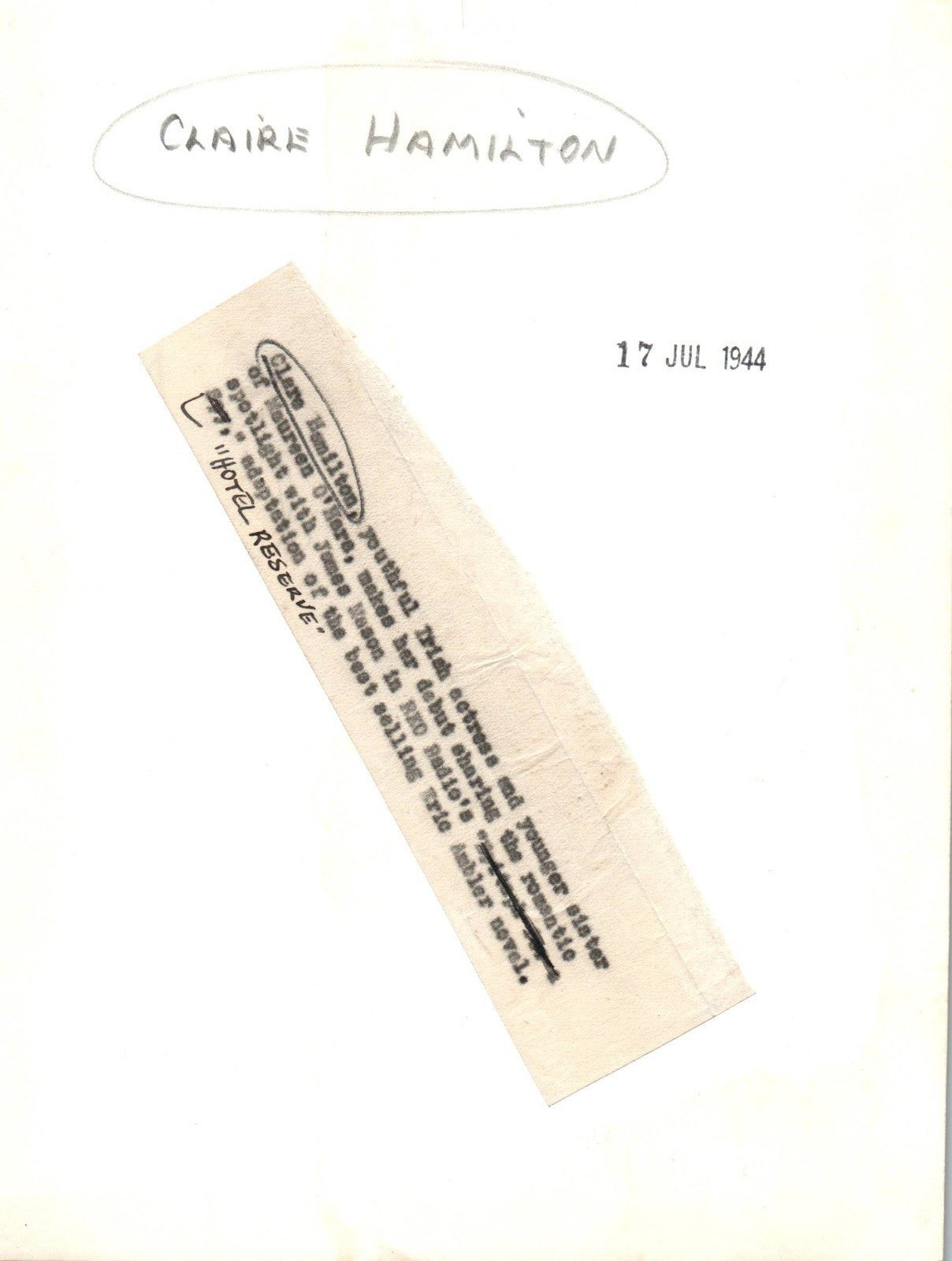 HOLLYWOOD CLAIRE BHAMILTON STYLISH POSE STUNNING PORTRAIT 1944 VINTAGE PHOTO MA
